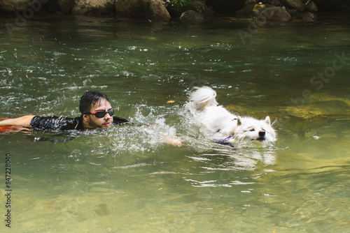 Man swimming with Samoyed dog