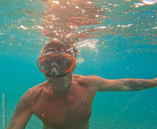 Man swims underwater in the Mediterranean Sea. The man is forty years old and of Caucasian origin
