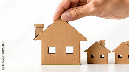 Man symbolically protecting home with cardboard house model, representing real estate security and insurance concepts.