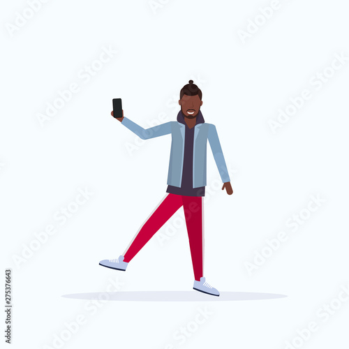 man taking selfie photo on smartphone camera african american male cartoon character posing white background flat full length