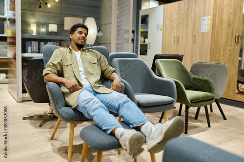 Man testing chair in furniture store shop