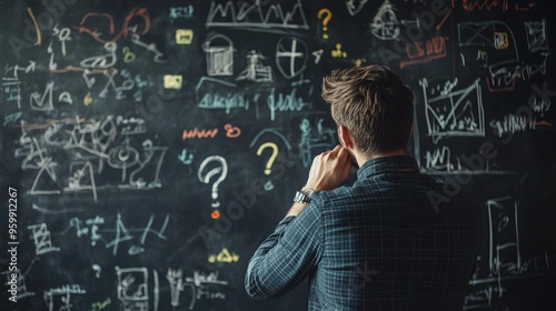 Man Thinking and Looking at Chalkboard with Drawings and Question Marks