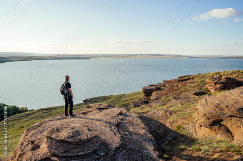 man travel blogger in a funny hat from Nepal mountain Hiker with backpack hike walking on orange huge stones landscape lake and hills