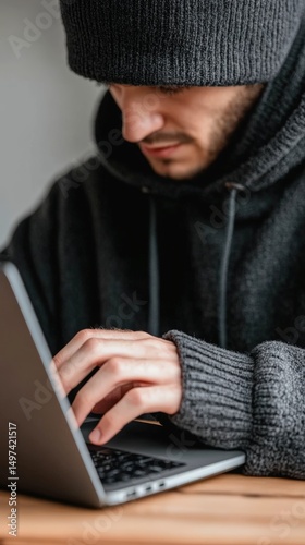 Man typing on laptop, focused on work, in cozy indoor setting during winter evening
