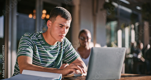Man, university student and campus with reading on laptop for assignment and essay writing. Male person, college learner and textbook for education with research or study for exam and assessment