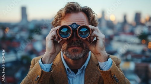Man Using Binoculars on Rooftop, Cityscape in Background
