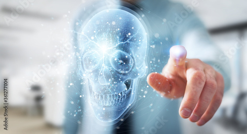 Man using digital x-ray skull holographic scan projection 3D rendering