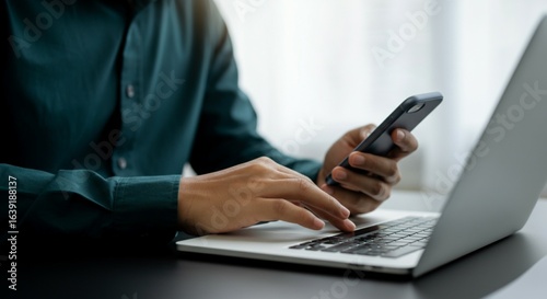 Man Using Smartphone and Laptop at Work Desk.