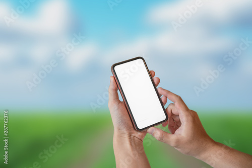 Man using smartphone on blur background. Blank screen smartphone for Graphic display montage.