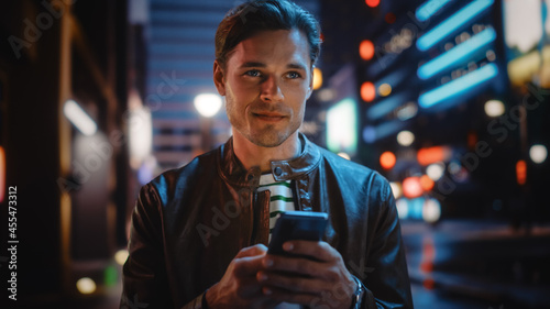 Man Using Smartphone Walking Through Night City Street Full of Neon Light. Smiling Stylish Man Using Mobile Phone, Social Media, Online Shopping, Texting on Dating App.