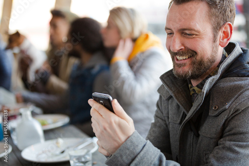 Man using smartphone while dining with friends