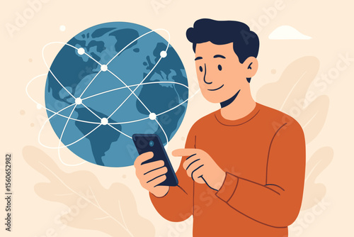 Man Using Smartphone with Global Network Connections, Internet Communication Technology, Digital Connectivity, Social Media, Online Interaction, Modern Flat Vector Illustration