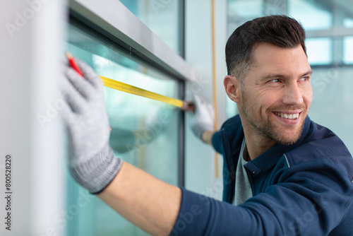 man using spirit level on window and looking over shoulder