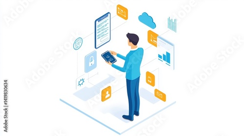 Man using tablet, connected devices, digital workflow, data management, technology concept