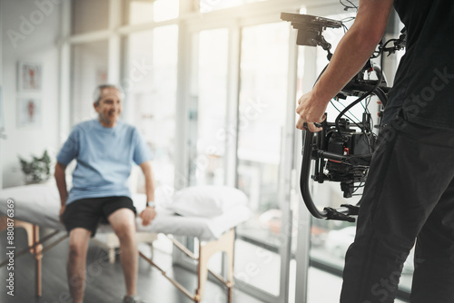 Man, videographer and recording with camera for vlog, online tutorial or filmmaking at studio. Male person, producer or director with elderly patient for behind the scenes, production or practice
