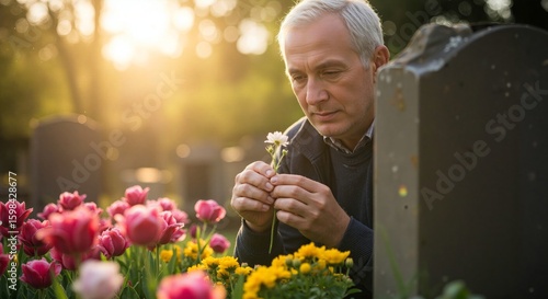 Man visits grave in cemetery with flowers, showing grief and remembrance. Senior man mourns lost loved one at grave site, expressing grief and sadness near fresh flowers.