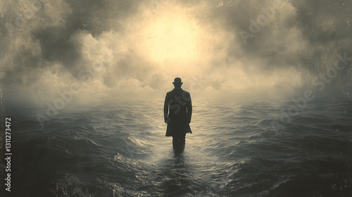 Man walking in the misty sea. Fantasy illustration background.