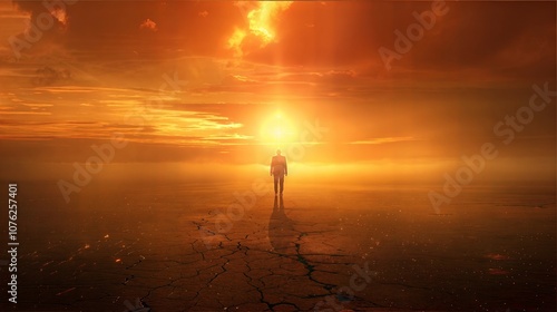 Man Walking Towards Glowing Horizon in Dramatic Sunset Over Barren, Cracked Earth Landscape
