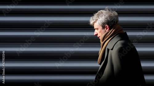 Man walks along a path with a blurred background of vertical lines during a bright day