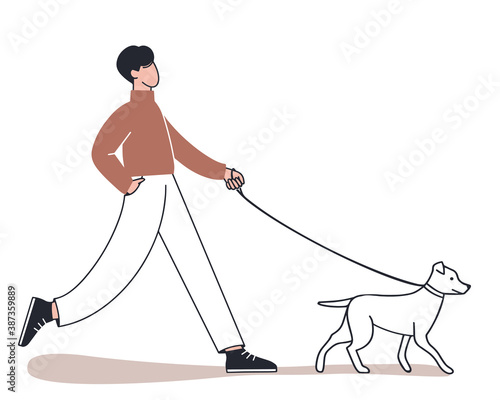 Man walks with his dog. Outline illustration. Vector