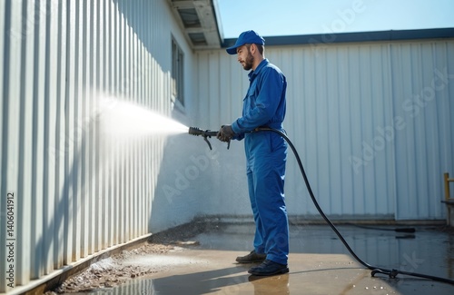 Man washes wall exterior with high-pressure water jet. Cleaning facade, removes dirt, grime, graffiti. Pro service worker wearing blue uniform, cap. Cleaning building construction maintenance.