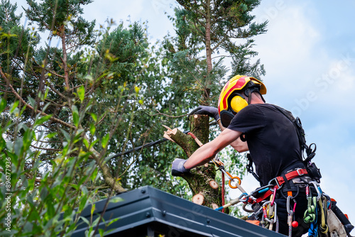 Man wearing a helmet and safety harness cuts down a large tree with a chainsaw
