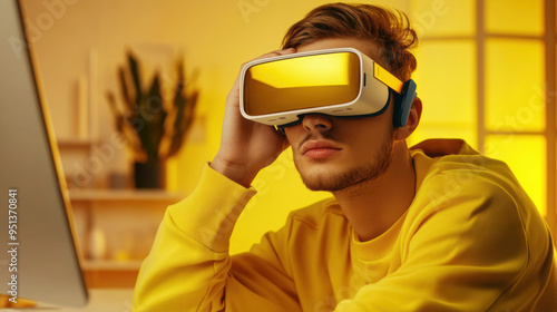 Man wearing a virtual reality headset, sitting at the computer, lightly touching her face with hand. Modern yellow colored interior. Innovative technology and immersive experience concept