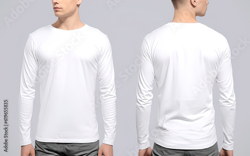 Man wearing a white T-shirt with long sleeves. Front and back view