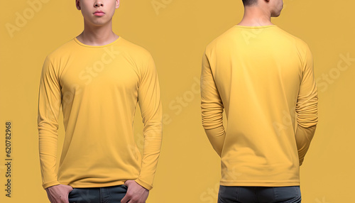 Man wearing a yellow T-shirt with long sleeves. Front and back view