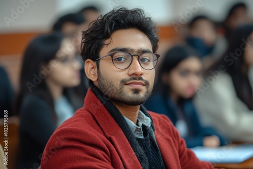 Man wearing glasses and a red jacket is sitting in a classroom. He is the center of attention. Indian Student with Slight Stubble in Red Blazer, Sitting in Front Row with Classmates Behind