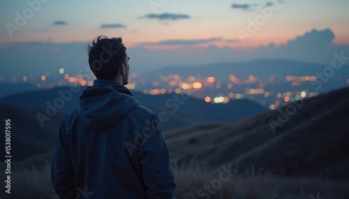 Man wearing hood looks at blurred cityscape at dusk from a mountain.