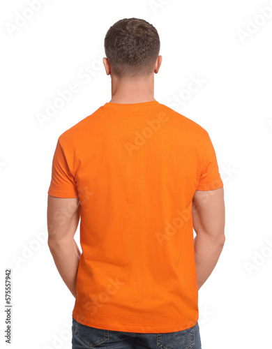 Man wearing orange t-shirt on white background, back view. Mockup for design