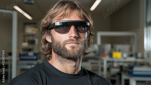 Man Wearing Smart Glasses with Facial Recognition Technology in Modern Office