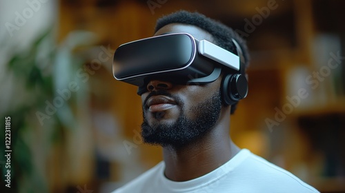 Man wearing virtual reality headset engaged in immersive digital experience in modern indoor setting