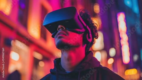 Man wearing VR headset in vibrant city at night.