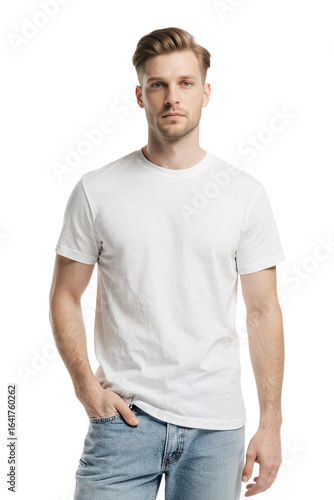 Man wearing white t-shirt and blue jeans, isolated on transparent background