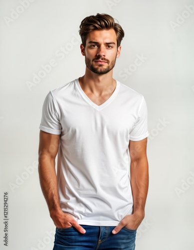 Man wears simple white v-neck t-shirt. Stands against white background. Casual style. Blank apparel. Stylish, basic clothing. Studio shot. Male model. Classic look. White cotton tee. Front view.