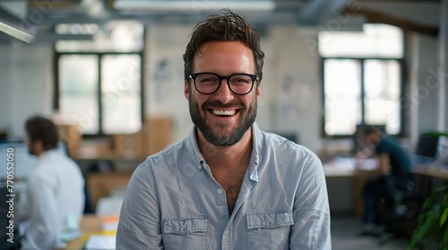 man who is smiling brightly in the office, Having fun at work day , Generative Ai