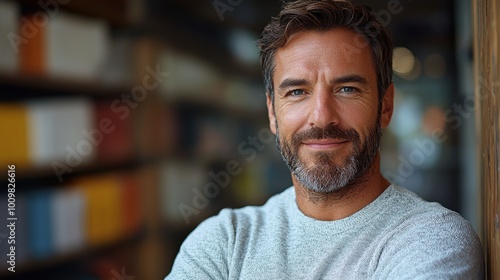 Man with a beard smiling confidently in a cozy cafe filled with colorful books during the day