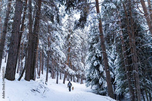 Man with a dog walking through a beautiful pine forest covered with snow. Beautiful winter day.