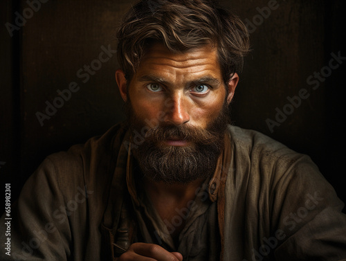 man with a French fork beard, soulful eyes and a pensive expression. Shot indoors, softbox lighting