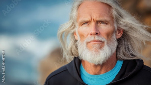 Man with a long beard and white hair is standing on a beach. He is wearing a blue hoodie and a blue shirt