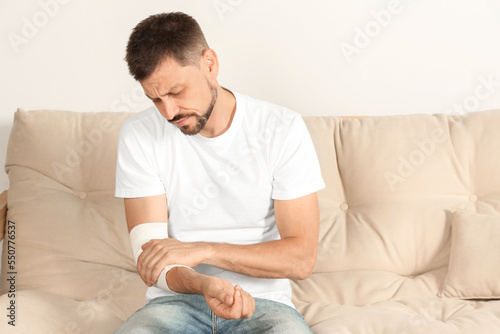 Man with arm wrapped in medical bandage on sofa indoors
