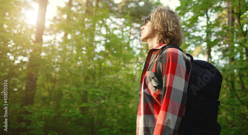 Man with backpack and sunglasses in the woods. Arc shoot.