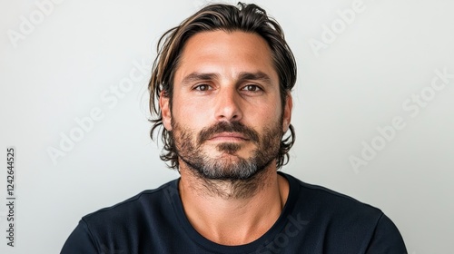 Man with Beard and Long Hair - Portrait of a man with brown hair and beard, wearing a dark shirt against a light gray background.