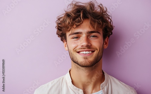 man with casual t-shirt is smiling at the camera, solid color background