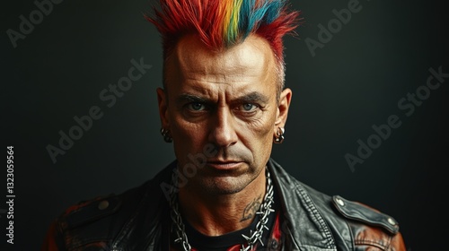 Man with colorful spiked hair and a black leather jacket, intense gaze.