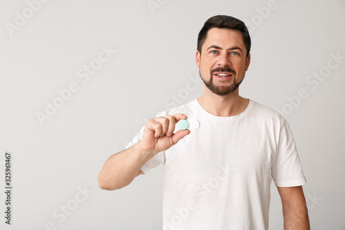 Man with contact lenses on light background