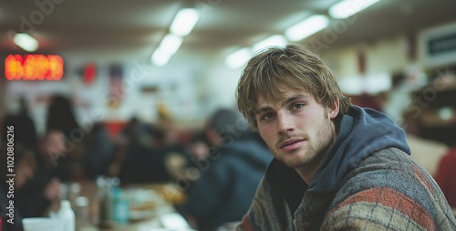 Man with curly hair is sitting at a table in dining hall. He is wearing a hoodie and a striped blanket. Positive homeless white man sits at a table in a bustling homeless shelter dining hall