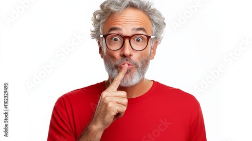 Man with glasses is looking surprised and pointing to his nose. He is wearing a red shirt